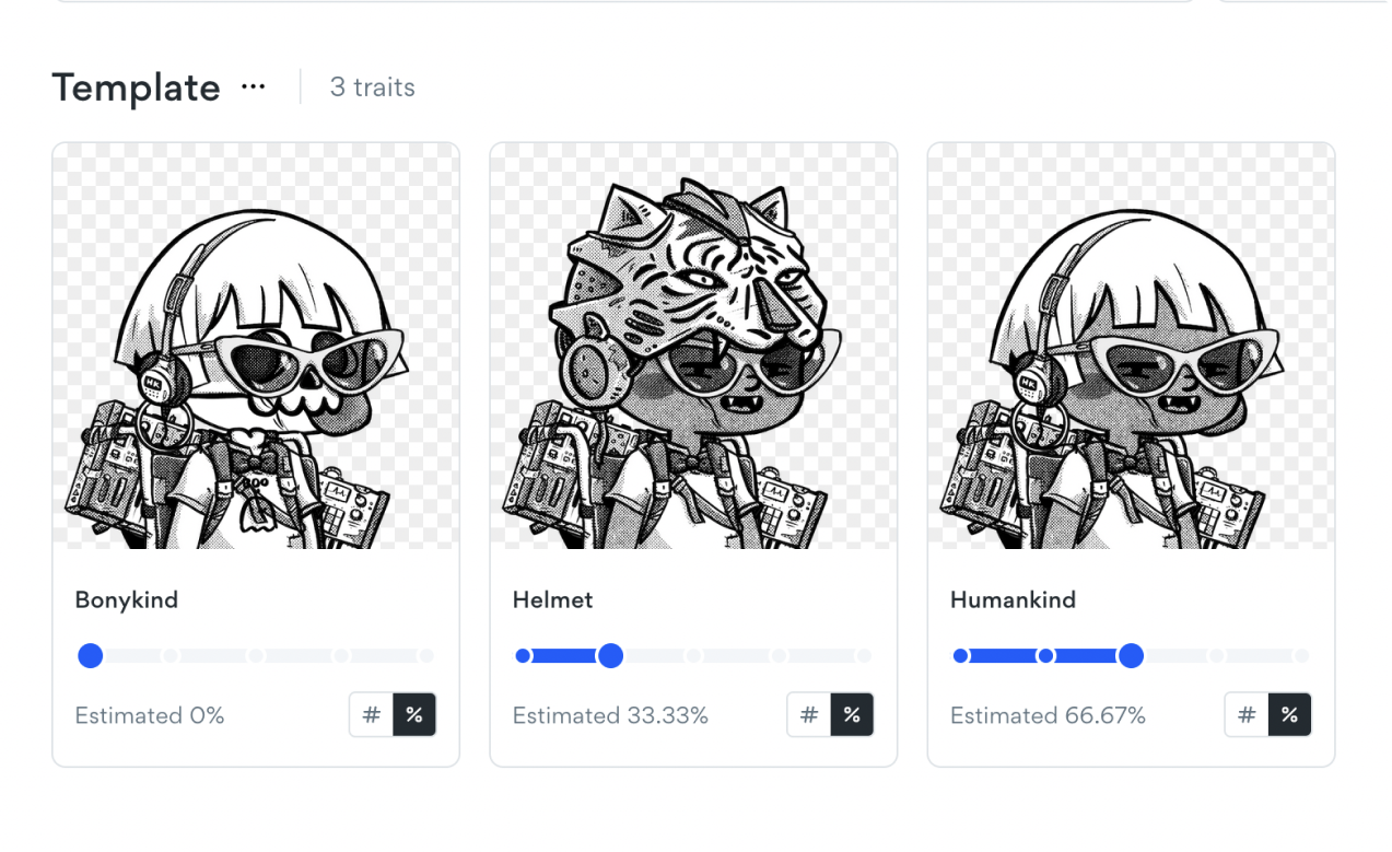 While this layer of complexity might be impossible to work around with other art generators, the Templates feature in Bueno made assigning traits to specific characters seamless.
